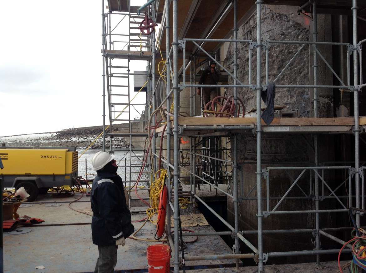Inspection and removal of all unsound concrete along upstream face of dam. The completed repairs consisted of placement of rebar dowels, wire fabric and shotcrete.