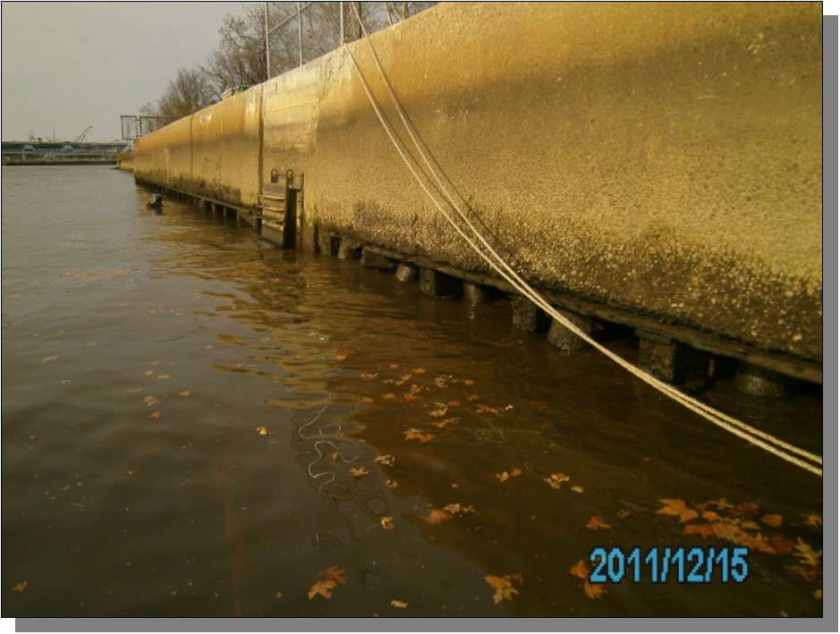 Inspection and repair of (400) non-bearing timber piles supporting the seawall. All repairs consisted of installing structural grade timber shims between the non-bearing piles and timber whalers. The shims were pre-drilled and nailed into the pile cap. All work was performed by barge during tidal variations on the Delaware River.